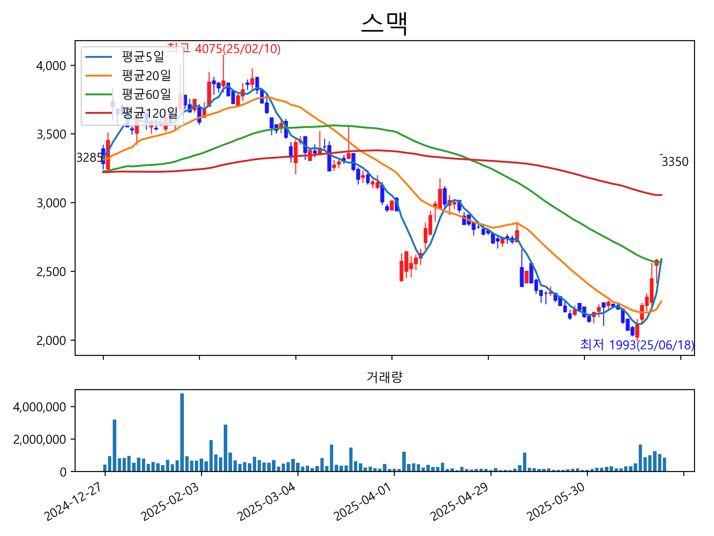 최근 6개월간 캔들차트 및 이동평균선입니다.