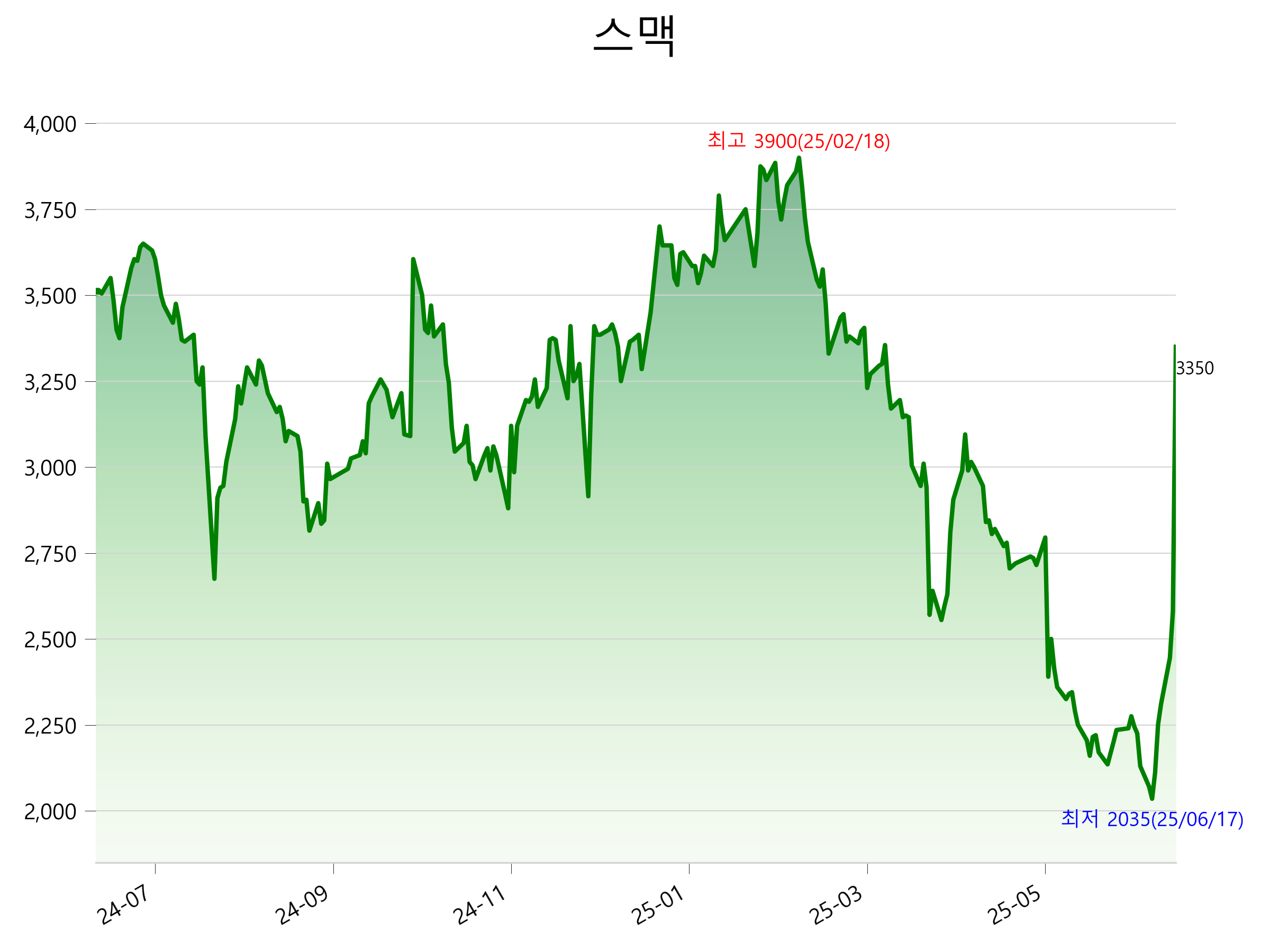 6월 25일 기준 주가는 3,350원 입니다. 아래는 최근 1년간의 주가흐름입니다.