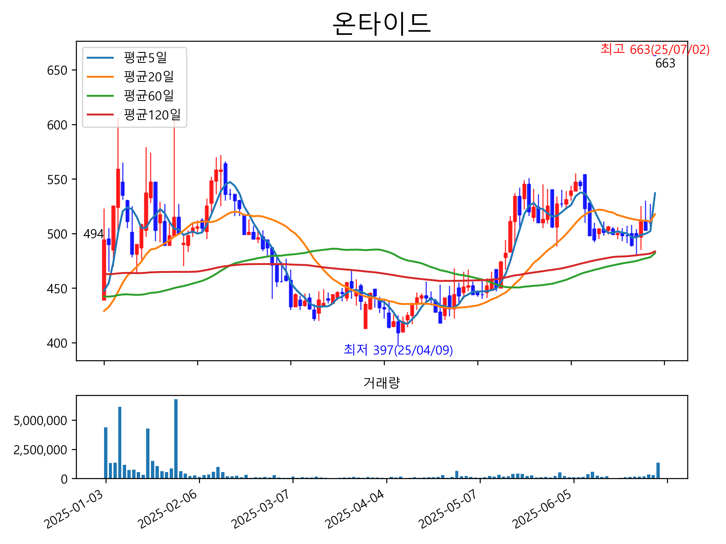 최근 6개월간 캔들차트 및 이동평균선입니다.