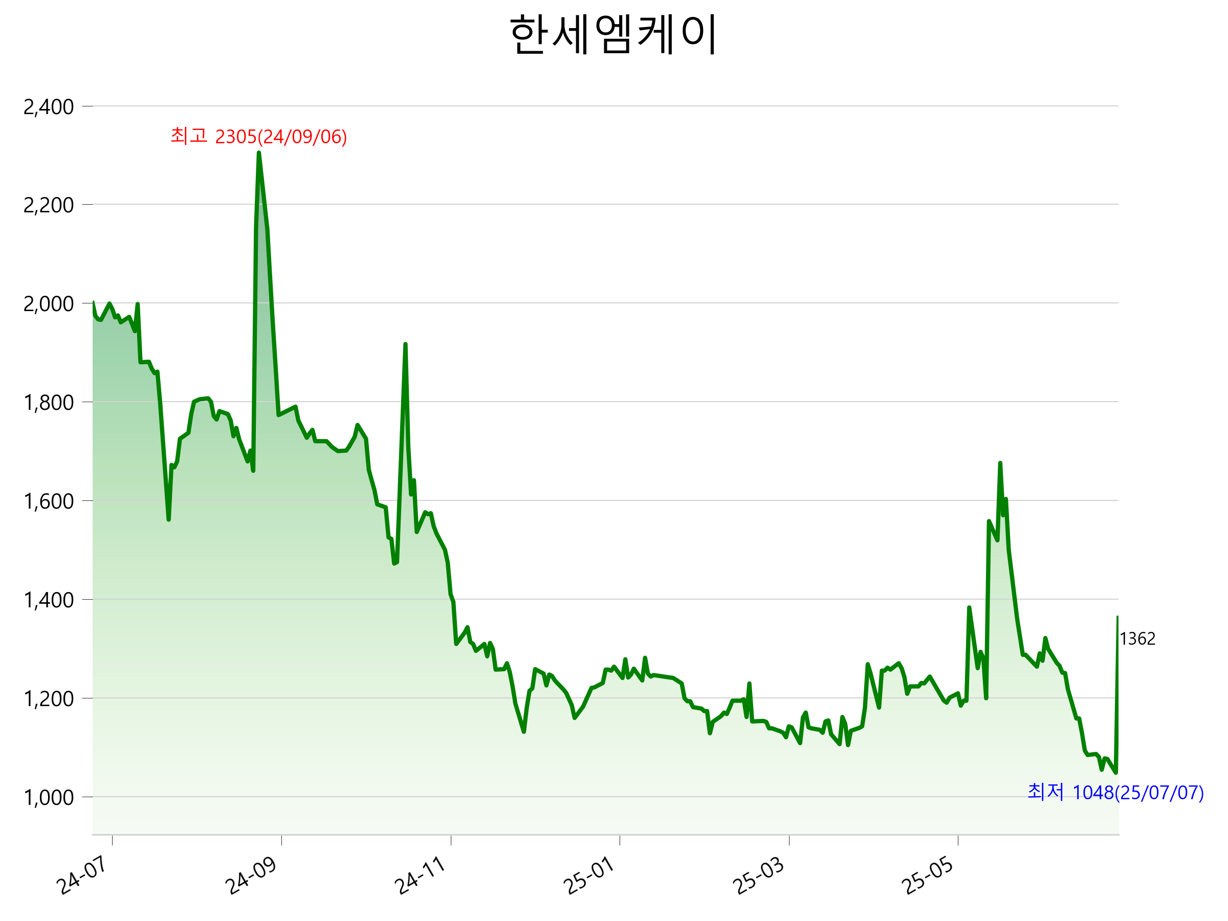 7월 8일 기준 주가는 1,362원 입니다. 아래는 최근 1년간의 주가흐름입니다.